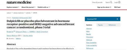近日,恒瑞医药自主研发创新药达尔西利(Dalpiciclib,CDK4/6抑制剂)联合氟维司群治疗激素受体阳性HER2阴性晚期乳腺癌的3期临床研究(DAWNA-1)在国际顶级权威杂志《自然医学》(Nature Medicine,2021年影响因子:53.44)全文在线发表。这是继三种CDK4/6抑制剂的PALOMA、MONARCH、MONALEESA系列乳腺癌领域3期研究陆续发表于NEJM、Lancet Oncology、JCO等期刊后,又一新型分子结构的CDK4/6抑制剂(也是国内原研的首个CDK4/6抑制剂)的3期临床研究数据,再次登上顶尖医学期刊。