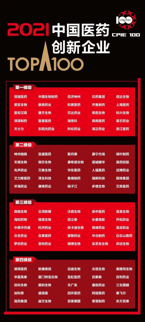 12月21日,2021中国医药企业家科学家投资家大会(简称“启思会”)在线上开幕,并隆重发布“2021中国医药创新企业100强”和“2021中国医药创新种子企业100强”。恒瑞医药以行业领先的综合创新实力,入选“2021中国医药创新企业100强”榜单,位列第一梯级。
