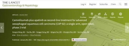 近日,恒瑞医药自主研发创新药卡瑞利珠单抗联合阿帕替尼二线治疗晚期食管鳞癌的多中心Ⅱ期临床研究(CAP 02研究)于国际知名医学期刊《柳叶刀》子刊《柳叶刀·胃肠病与肝脏病学》杂志( Lancet Gastroenterol & Hepatol,IF:18.5 )全文在线发表。