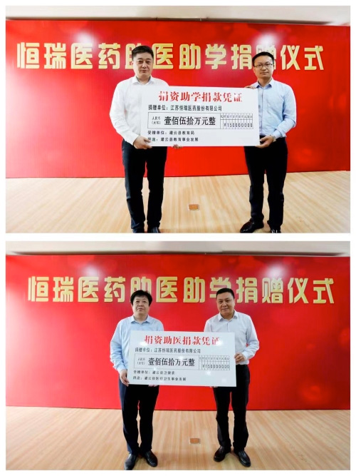 5月24日上午,在连云港市灌云县政府举办了恒瑞医药助医助学捐赠仪式,灌云县县委书记苏锋、副县长周建军及县卫健委、教育局领导出席。在本次捐赠仪式上,公司向灌云县卫健委、教育局各捐赠善款150万元,合计300万元支持地方卫生、教育有关项目开展,助力乡村振兴,改善地方卫生条件,提升教育基础设施建设。