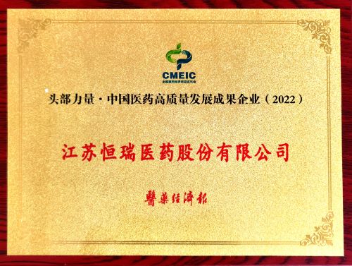 2月19日,由国家药品监督管理局南方医药经济研究所指导、医药经济报主办的第34届全国医药经济信息发布会在珠海举行。当晚,大会发布了2022年度头部力量·中国医药高质量发展成果企业和品牌,恒瑞医药再次蝉联“头部力量·中国医药高质量发展成果企业”,公司创新药艾瑞恩®(瑞维鲁胺片)荣膺“头部力量·中国医药高质量发展成果品牌(2022)”。