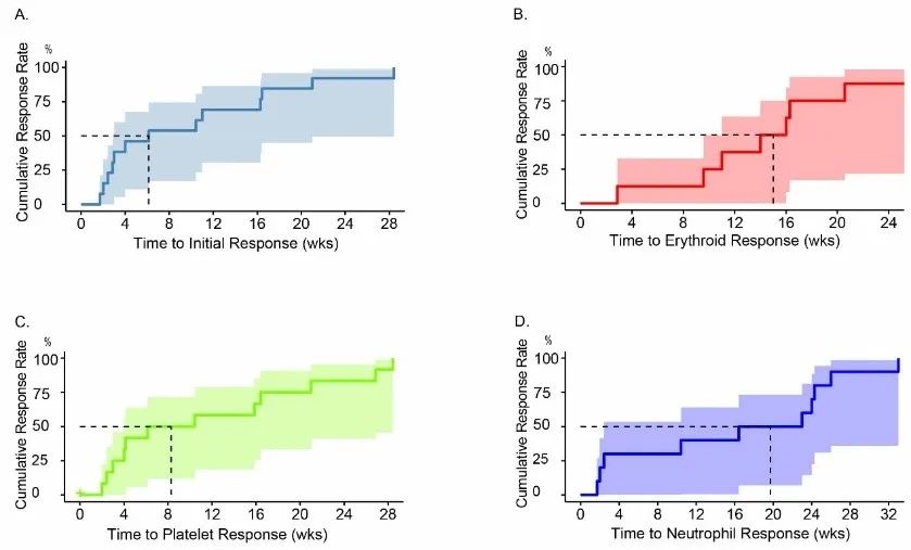 共纳入19例TD-NSAA患者,并接受海曲泊帕联合CsA治疗。中位随访时间8.2(0.8~16.8)个月。74%的患者(14/19)在≥1个谱系中有治疗反应,其中13例患者(68%)达到部分反应,1例患者(5%)达到完全反应。至血液学反应的中位时间为6.1(1.7~28.4)周。15例患者中有9例(60%)获得红系反应;19例患者中13例(68%)获得血小板反应,14例患者中11例(79%)获得中性粒细胞反应。中位至红系、血小板和中性粒细胞反应的时间分别为15周、8.3周和19.7周(如图),存活率为95%。