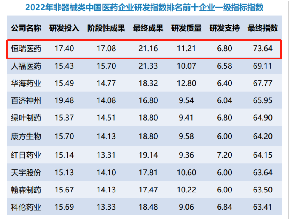研发量质齐升,恒瑞医药蝉联非器械类中国医药企业研发指数排名榜首