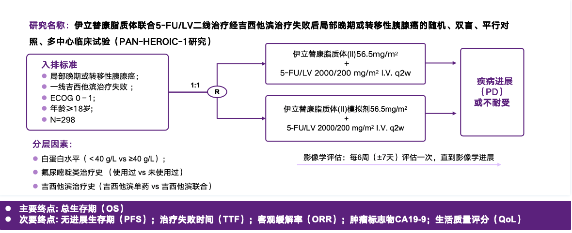 PAN-HEROIC-1研究是由中国药科大学附属南京天印山医院秦叔逵教授和上海交通大学附属仁济医院王理伟教授牵头开展的多中心、随机、双盲、对照的III期临床研究,旨在评估伊立替康脂质体(II)+5-FU/LV对比安慰剂+5-FU/LV两种方案二线治疗吉西他滨治疗失败后的局晚期/转移性胰腺癌的疗效和安全性。