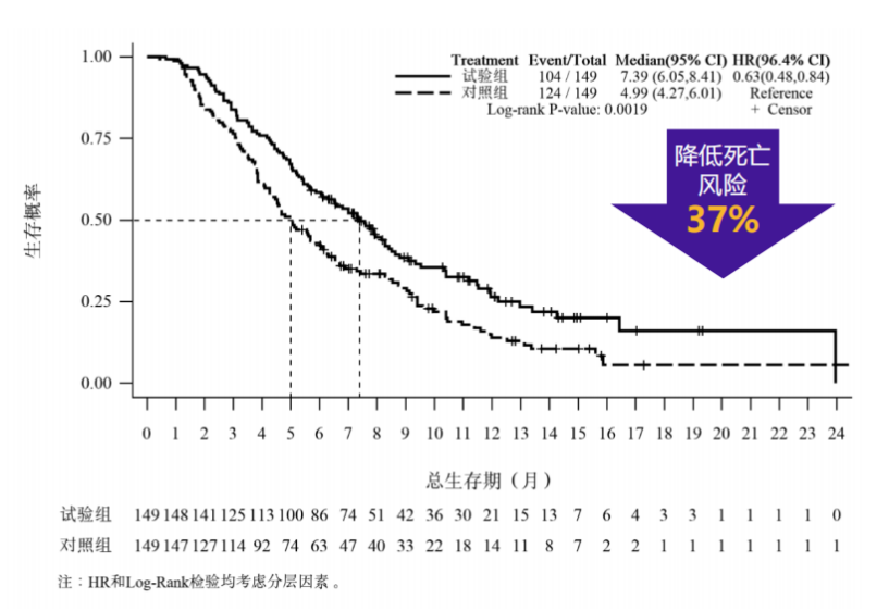 在2022年欧洲肿瘤内科学会(ESMO)大会上,PAN-HEROIC-1研究结果重磅公布。主要研究终点方面,伊立替康脂质体(II)组较安慰剂组的中位OS显著延长2.4个月(7.39个月vs.4.99个月,HR=0.63,P=0.0019),死亡风险降低了37%1(图2)。