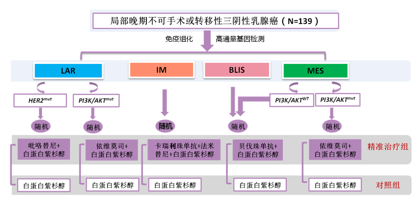 FUTURE-SUPER研究是一项针对mTNBC一线治疗的随机对照伞型II期试验,旨在进一步评估基于分子亚型和基因组标志物的精准治疗在mTNBC一线治疗中的疗效。研究共入组139例mTNBC或局部晚期无法手术的患者,根据TNBC亚型和基因组生物标志物分为5个治疗臂,并按1:1随机接受白蛋白结合型紫杉醇(Nab-P)的标准化疗(对照组)或Nab-P联合靶向/免疫药物精准治疗(精准治疗组),具体方案如图1。主要研究终点为无进展生存期(PFS),次要研究终点包括每个队列中的PFS、ORR、总生存期(OS)和安全性。