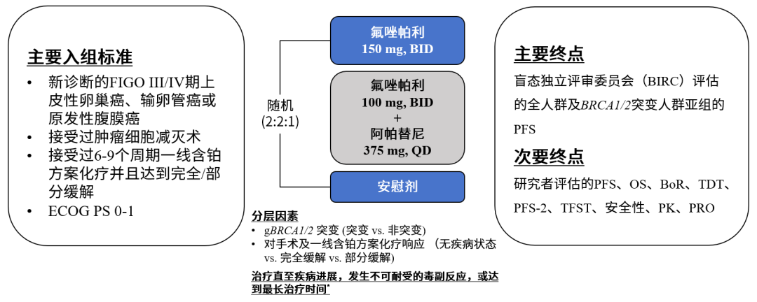 研究的主要研究终点为由盲态独立评审委员会(BIRC)根据RECIST v1.1标准评估的全人群及BRCA1/2突变人群亚组的PFS,次要研究终点包括研究者评估的PFS、总体最佳疗效(BoR)、从随机分组到治疗结束或死亡的时间(TDT)、总生存期(OS)、安全性等。