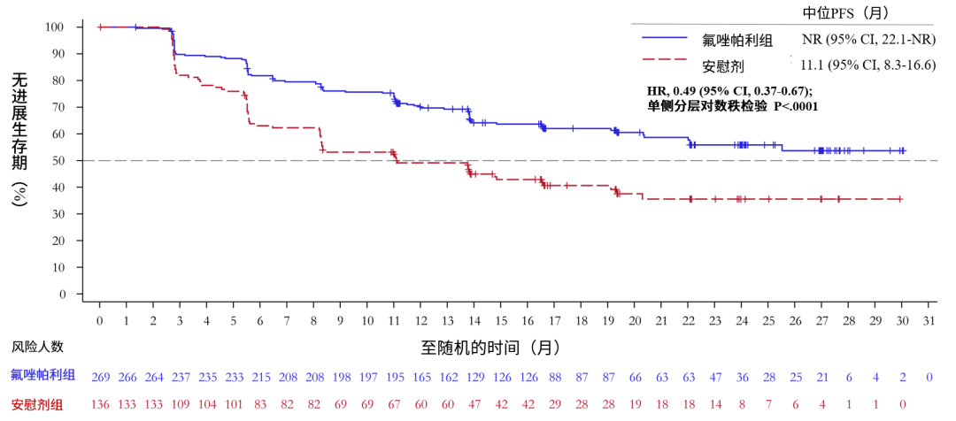 截至2023年3月31日,对297例事件(占预期总事件数的66.6%)进行预先设定的期中分析,本次会议报告了氟唑帕利治疗组对比安慰剂组的结果。氟唑帕利治疗组的中位随访时间为21个月,安慰剂组为20.8个月。BIRC根据RECIST v1.1评估的氟唑帕利组全人群PFS未达到(NR)(95% CI:22.1-NR),安慰剂组PFS为11.1个月(95% CI:8.3-16.6),氟唑帕利治疗组全人群PFS得到显著改善(HR=0.49,95% CI:0.37-0.67;单侧P<0.0001)。