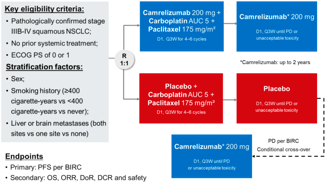 既往未接受治疗的晚期鳞状NSCLC患者按1:1随机分组接受卡瑞利珠单抗(200mg)联合卡铂和紫杉醇或安慰剂加卡铂(AUC 5)和紫杉醇(175mg/m2)Q3W治疗,共4-6个周期,随后接受卡瑞利珠单抗或安慰剂维持治疗。安慰剂组的患者在疾病进展后允许交叉至卡瑞利珠单抗组治疗。