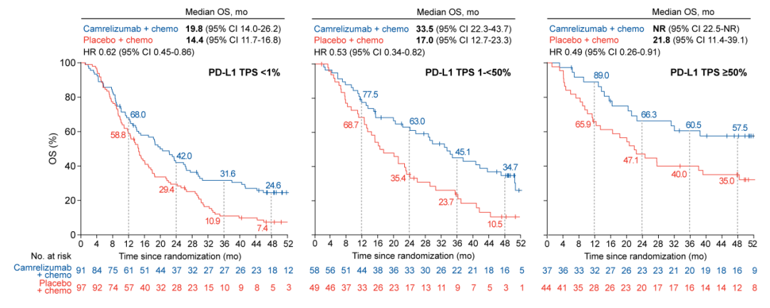无论基线人口统计学和临床特征如何,卡瑞利珠单抗+化疗组对比安慰剂+化疗组的OS获益都是显而易见的。