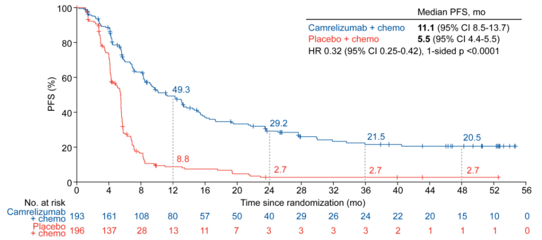 389例患者随机接受治疗(卡瑞利珠单抗+化疗,n=193;安慰剂+化疗,n=196),截至2023年12月15日,中位随访时间为53.5个月(范围47.5-61.0)。卡瑞利珠单抗+化疗组对比安慰剂+化疗组的中位OS显著延长(27.4个月vs.15.5个月;HR=0.56,95% CI:0.45-0.72)。与安慰剂+化疗组比,卡瑞利珠单抗+化疗组的2年、3年和4年的OS获益率稳健,均提升约20%。