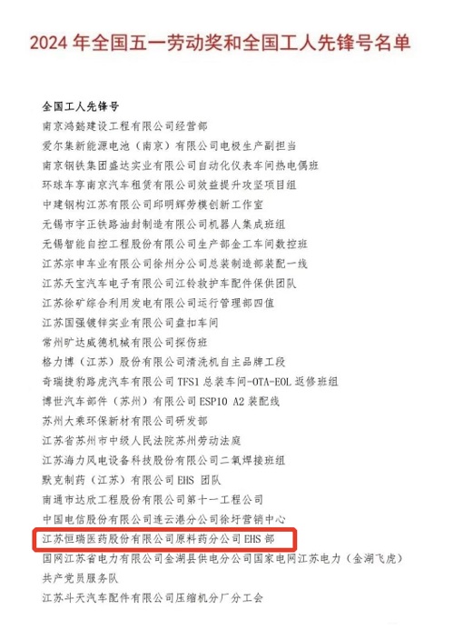 为表彰先进、树立典型,大力弘扬劳模精神、劳动精神、工匠精神,在“五一”国际劳动节即将到来之际,中华全国总工会公布了2024年“全国五一劳动奖”和“全国工人先锋号”表彰名单,江苏恒瑞医药股份有限公司原料药分公司EHS部荣获“全国工人先锋号”称号。