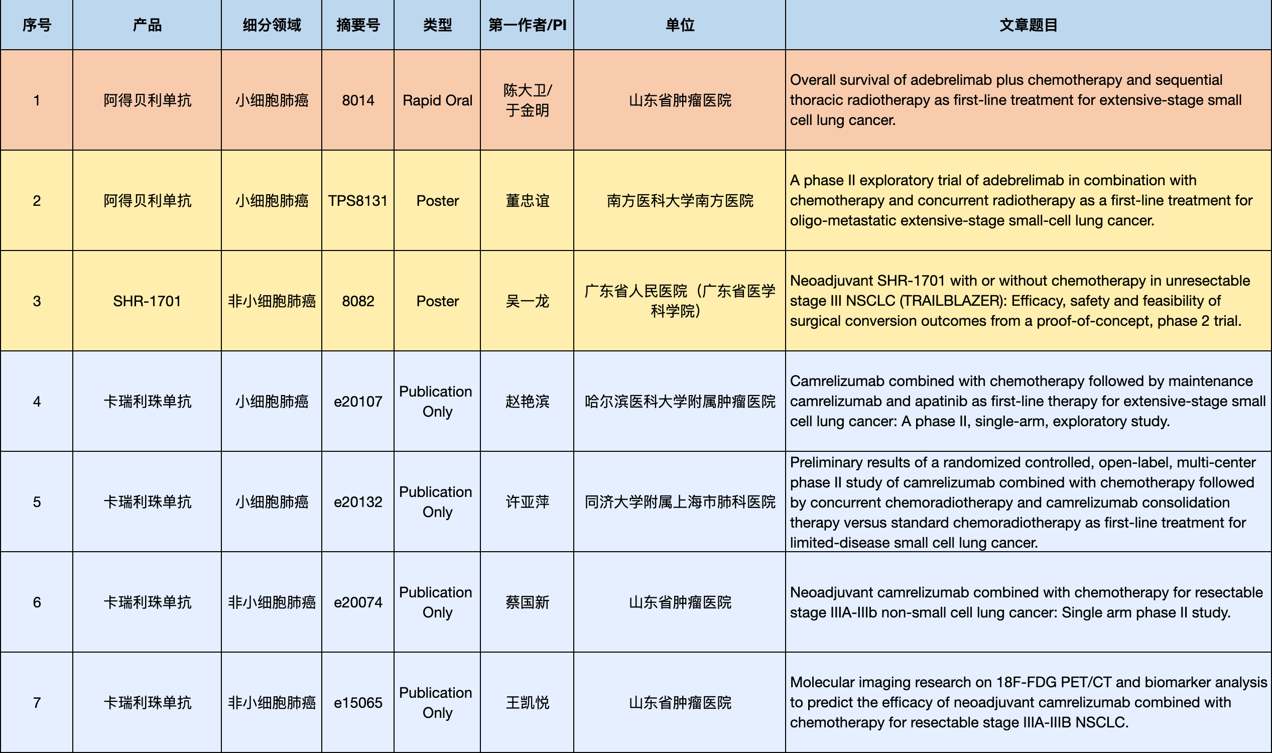 在肺癌领域,阿得贝利单抗、卡瑞利珠单抗、SHR-1701等产品的单药或联合治疗方案相关研究入选1项Rapid Oral(快速口头报告),2项壁报展示和4项线上发表。作为我国自主研发的首个在小细胞肺癌获批适应症的PD-L1抑制剂,阿得贝利单抗一直备受瞩目。以CAPSTONE-1为代表的多项研究展现出其在广泛期小细胞肺癌治疗上的疗效与安全性,得到国内外学界的广泛认可2。目前阿得贝利单抗在小细胞肺癌领域的探索仍在继续,多项临床研究正在进行当中。其中,由山东省肿瘤医院于金明院士团队开展的“阿得贝利单抗联合化疗序贯胸部放疗一线治疗广泛期小细胞肺癌的生存结果”入选本次ASCO大会的Rapid Oral,有望为广泛期小细胞肺癌一线治疗带来新的选择。