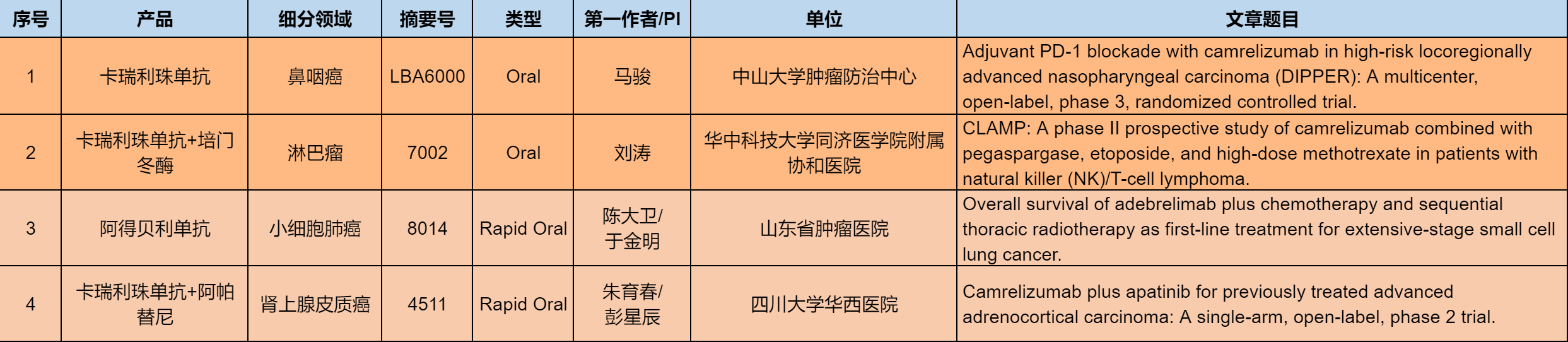 本次ASCO年会,恒瑞医药共有4项创新药研究成功入选口头报告,其中3项与公司自主研发的经典PD-1抑制剂卡瑞利珠单抗有关,展现了公司强大的科研创新实力: