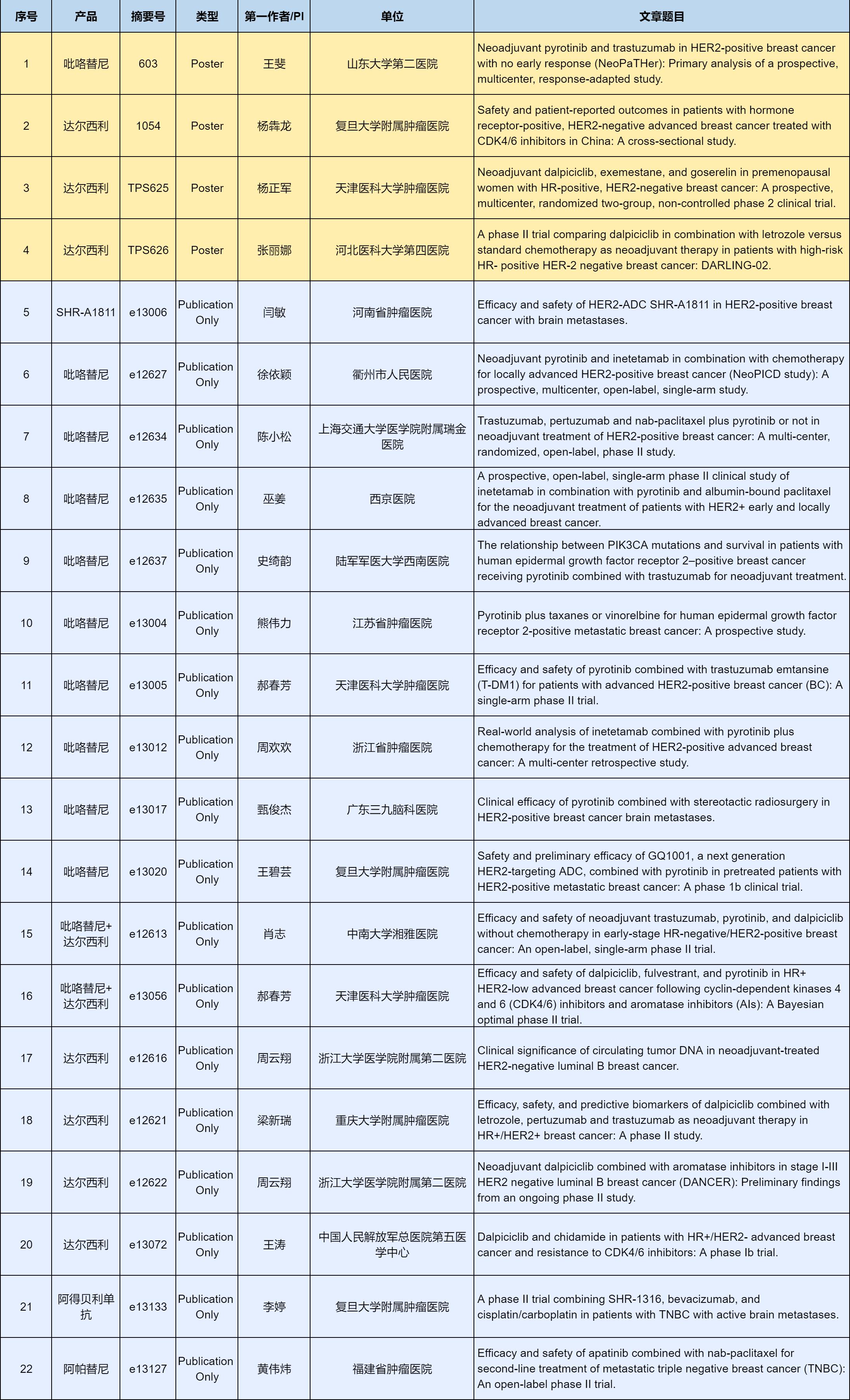 在乳腺癌领域,公司创新药吡咯替尼、达尔西利、阿帕替尼、阿得贝利单抗、SHR-A1811,或产品间联合或联合化疗,共有22项研究入选(包括4项壁报展示和18项线上发表)。其中吡咯替尼占据12项,较为全面地展示了这款中国首个自主研发抗HER1/HER2/HER4靶向药在乳腺癌治疗中的显著特点和潜力,引领乳腺癌治疗新格局。