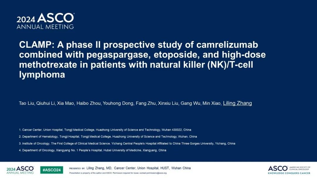 [1] Tao Liu, Liling Zhang, et al. CLAMP: A phase II prospective study of camrelizumab combined with pegaspargase, etoposide, and high-dose methotrexate in patients with natural killer (NK)/T-cell lymphoma.2024 ASCO Oral 7002.