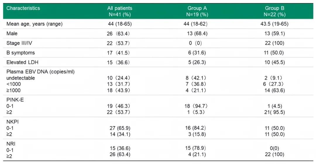 2020年7月至2022年12月共纳入41例NK/T细胞淋巴瘤患者,36例为新诊断患者,5例为复发患者。其中14例患者为中枢神经系统(CNS)侵犯高风险,伴有2-4个NKPI危险因素(Ann Arbor期III或IV期、B症状、局部淋巴结受累、乳酸脱氢酶升高),1例合并噬血细胞综合征(HLH)。