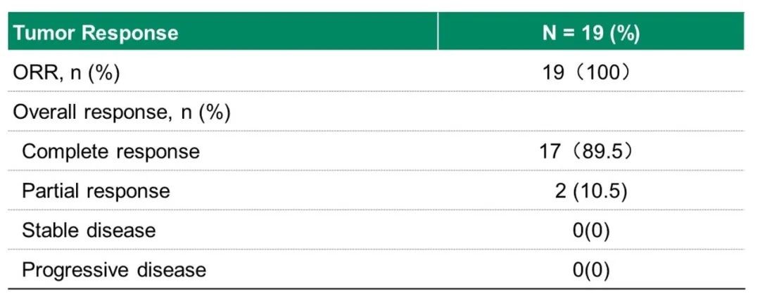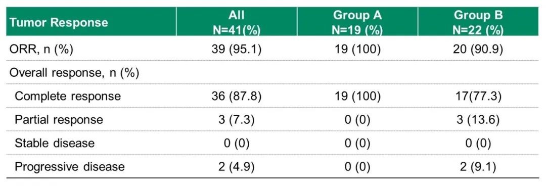 放疗结束时,A组ORR达到100%(19/19),CRR为89.5%(17/19),部分缓解(PR)率为10.5%(2/19)。