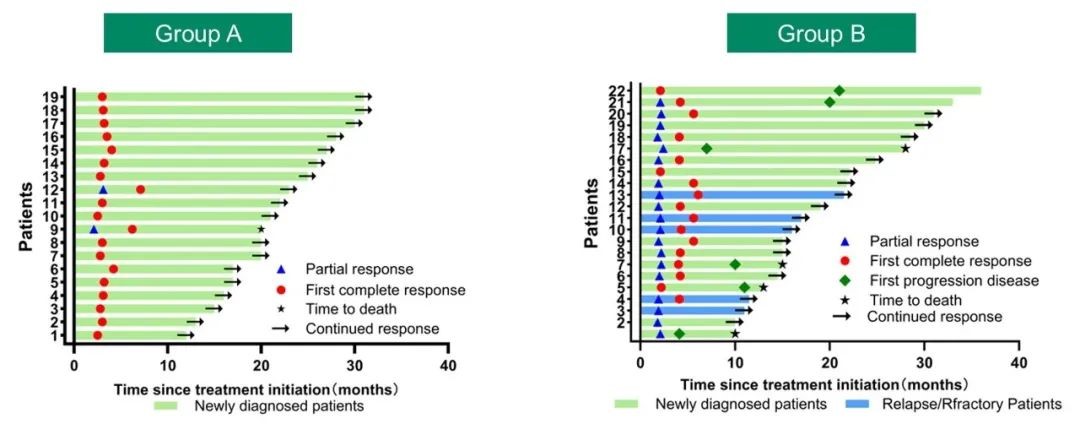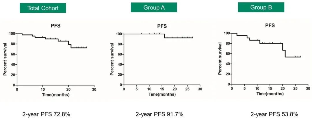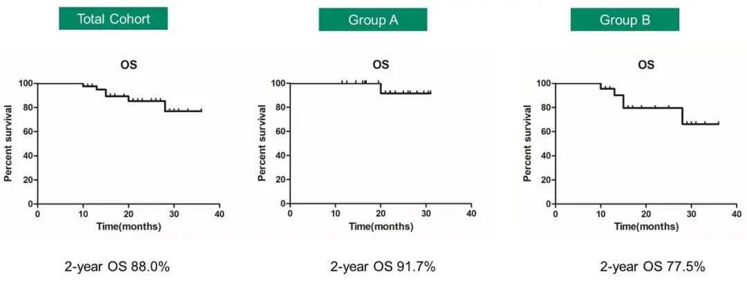 在随访期间,没有患者发生HLH或中枢神经系统受累。中位随访时间为21个月。整个队列的2年PFS率为72.8%,A组和B组2年PFS率分别为91.7%和53.8%。2年OS率为88.0%,A组和B组2年OS率分别为91.7%和77.5%。A组和B组均未达到中位缓解持续时间。安全性方面,整体可控。