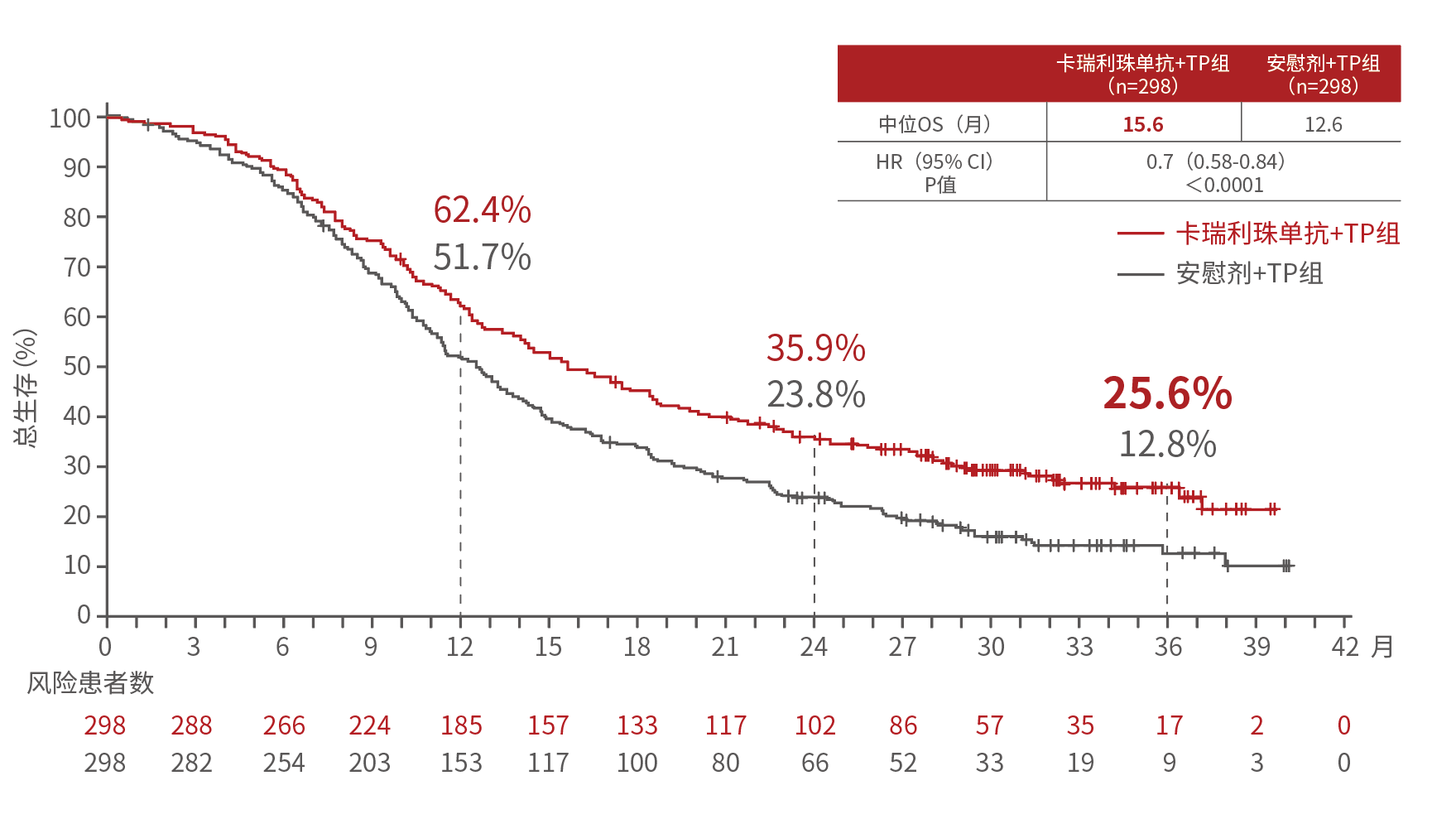 图2. 卡瑞利珠单抗+化疗 vs 安慰剂+化疗在全人群中的生存曲线