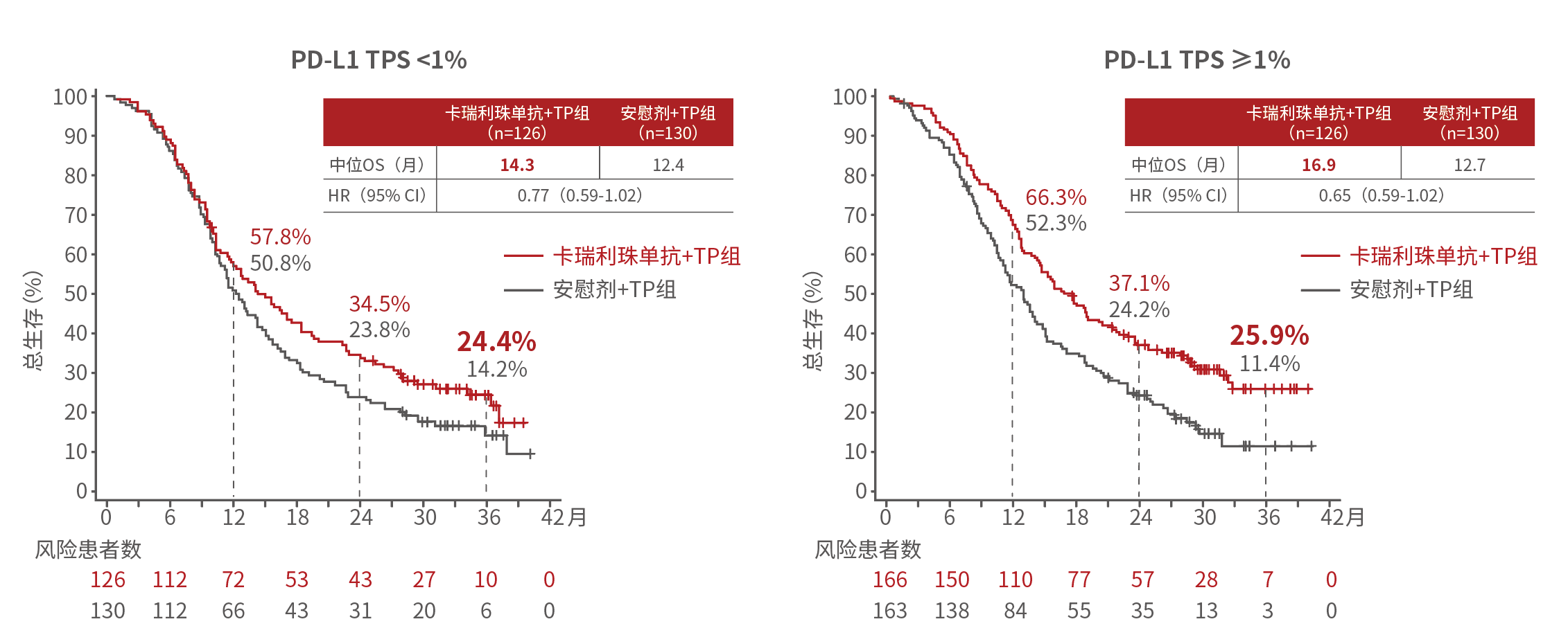 图3. 卡瑞利珠单抗+化疗 vs 安慰剂+化疗在PD-L1 TPS<1%和PD-L1 TPS≥1%患者中的生存曲线