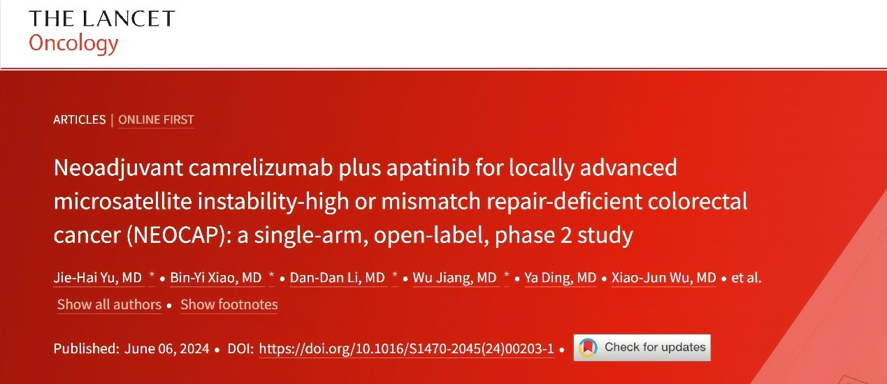 1. Jiehai Yu, Binyi Xiao, Dandan Li, et al. Neoadjuvant camrelizumab plus apatinib for locally advanced microsatellite instability-high or mismatch repair-deficient colorectal cancer (NEOCAP): a single-arm, open-label, phase 2 study.Lancet Oncol.Published: June 06,2024. DOI:https://doi.org/10.1016/S1470-2045(24)00203-