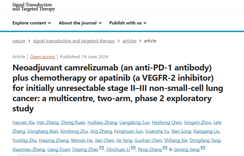 1. Xia, H., Zhang, H., Ruan, Z. et al. Neoadjuvant camrelizumab (an anti-PD-1 antibody) plus chemotherapy or apatinib (a VEGFR-2 inhibitor) for initially unresectable stage II–III non-small-cell lung cancer: a multicentre, two-arm, phase 2 exploratory study. Sig Transduct Target Ther 9, 145 (2024). https://doi.org/10.1038/s41392-024-01861-w.
