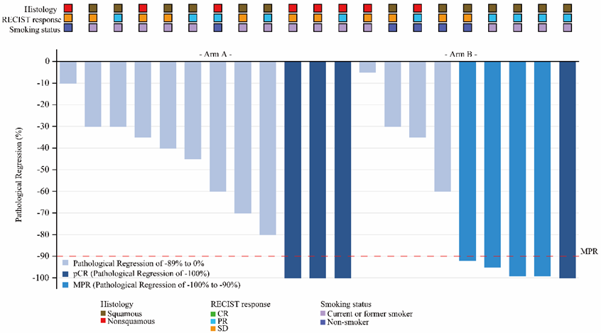 结果表明,A组手术率为50.0%(15/30),B组手术率为42.9%(9/21),所有手术患者均实现了R0切除。在手术患者中,A组的MPR率和pCR率均为20.0%,B组分别为55.6%和11.1%。两组患者的客观缓解率(ORR)分别为33.3%和55.6%。在22.4个月的中位随访期内,A组的中位EFS未达到,B组的中位EFS为16.8个月。安全性方面,与既往报道的新辅助免疫联合治疗相近。整个研究过程中未出现治疗相关死亡事件,无新辅助治疗相关手术推迟,无术后90天内死亡病例,整体安全性可控且可耐受。