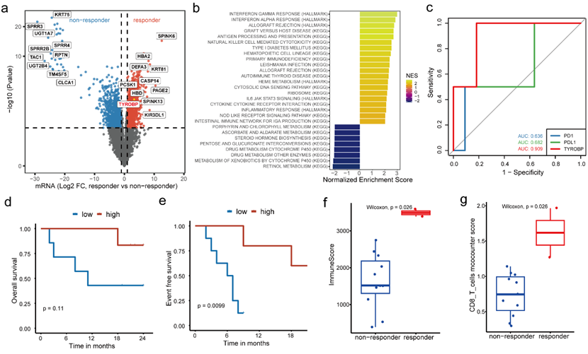 此外,该研究还探索了对新辅助卡瑞利珠单抗联合阿帕替尼治疗敏感的生物标志物。通过对13例患者基线肿瘤样本的分析,研究者发现TYROBP在应答者中显著高表达,且其较PD-1和PD-L1具有更好的治疗应答预测效能(AUC=0.909),高表达TYROBP的患者具有更好的EFS和OS。这一发现在多个已发表的公开数据集中亦得到验证6-9。进一步的基因富集分析(Gene set enrichment analysis,GSEA)表明,“interferon gamma response”、“NK cell-mediated cytotoxicity”和“antigen processing and presentation”等通路在治疗应答者中显著富集。此外,应答者的肿瘤中有更高水平的免疫评分和CD8+T细胞浸润,且T细胞相关基因CCL5、NKG7亦显著高表达。提示TYROBP可能与治疗响应相关。