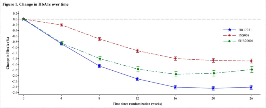 结果:第26周时,与INS068组和SHR20004组的受试者相比,HR17031组HbA1c较基线降低幅度更大(-2.4% vs-1.5%、-1.7%;如下图),表明HR17031降糖效果优于INS068(差值[D]=-0.9%)和SHR20004(D=-0.7%)。HR17031组可使更多患者达到HbA1c<7%和<6.5%的目标(<7%,81.4%;<6.5%,74.3%),高于INS068(47.8%;26.4%)和SHR20004(55.6%;41.1%)。与INS068相比,应用HR17031可减轻体重(-0.1kg vs 2.0kg)。应用HR17031的胰岛素日剂量低于INS068(30.3 U/d vs 38.1 U/d)。以上结果均有统计学意义(P<0.001)。安全性方面,发生<3.0 mmol/L的低血糖事件,HR17031(5.5%)和INS068(4.4%)相似,未发生预期外的安全问题。
