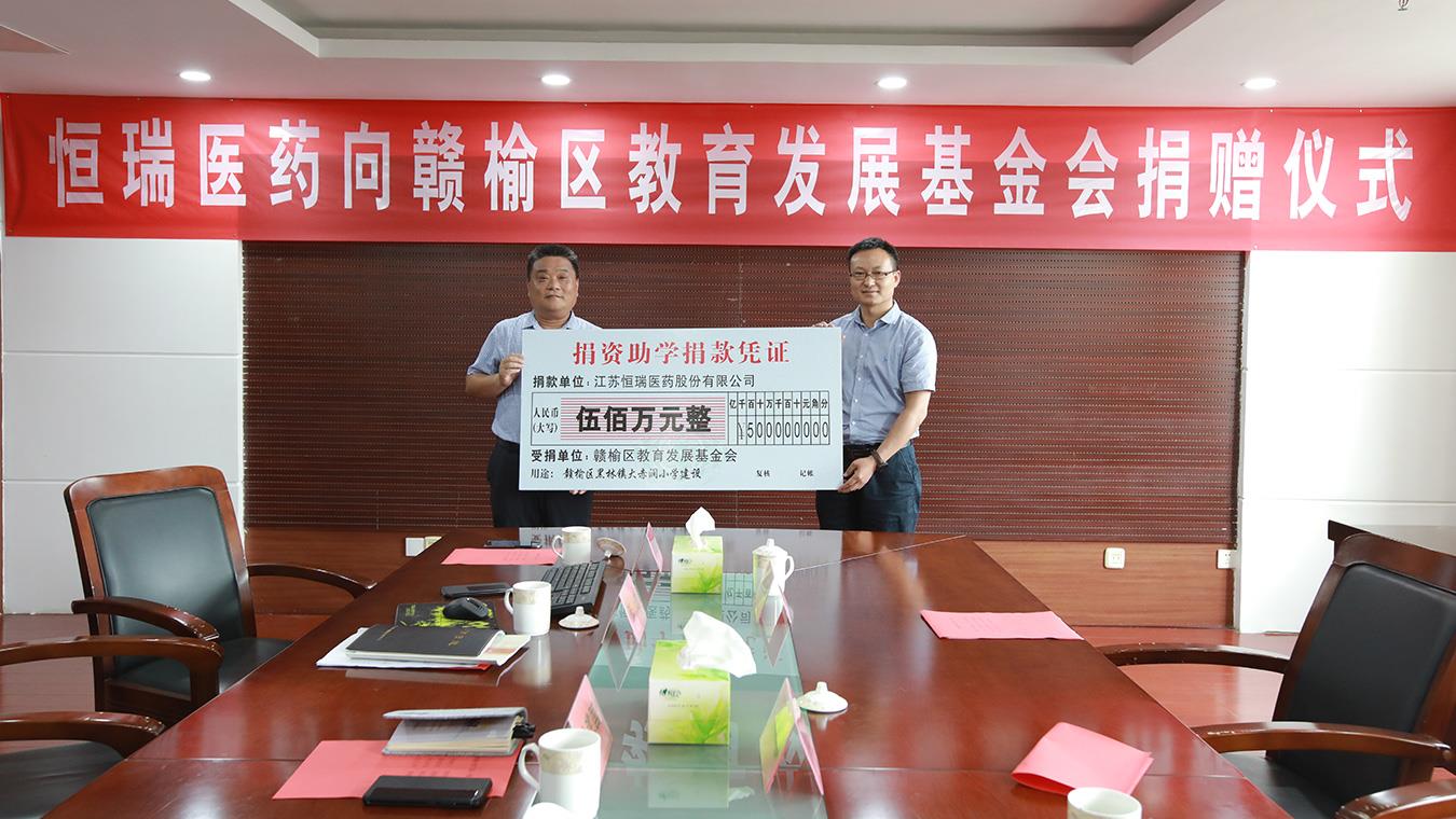2020年6月,恒瑞医药向赣榆区教育发展基金会捐赠500万元,用于赣榆区黑林镇大赤涧小学教育教学设施建设