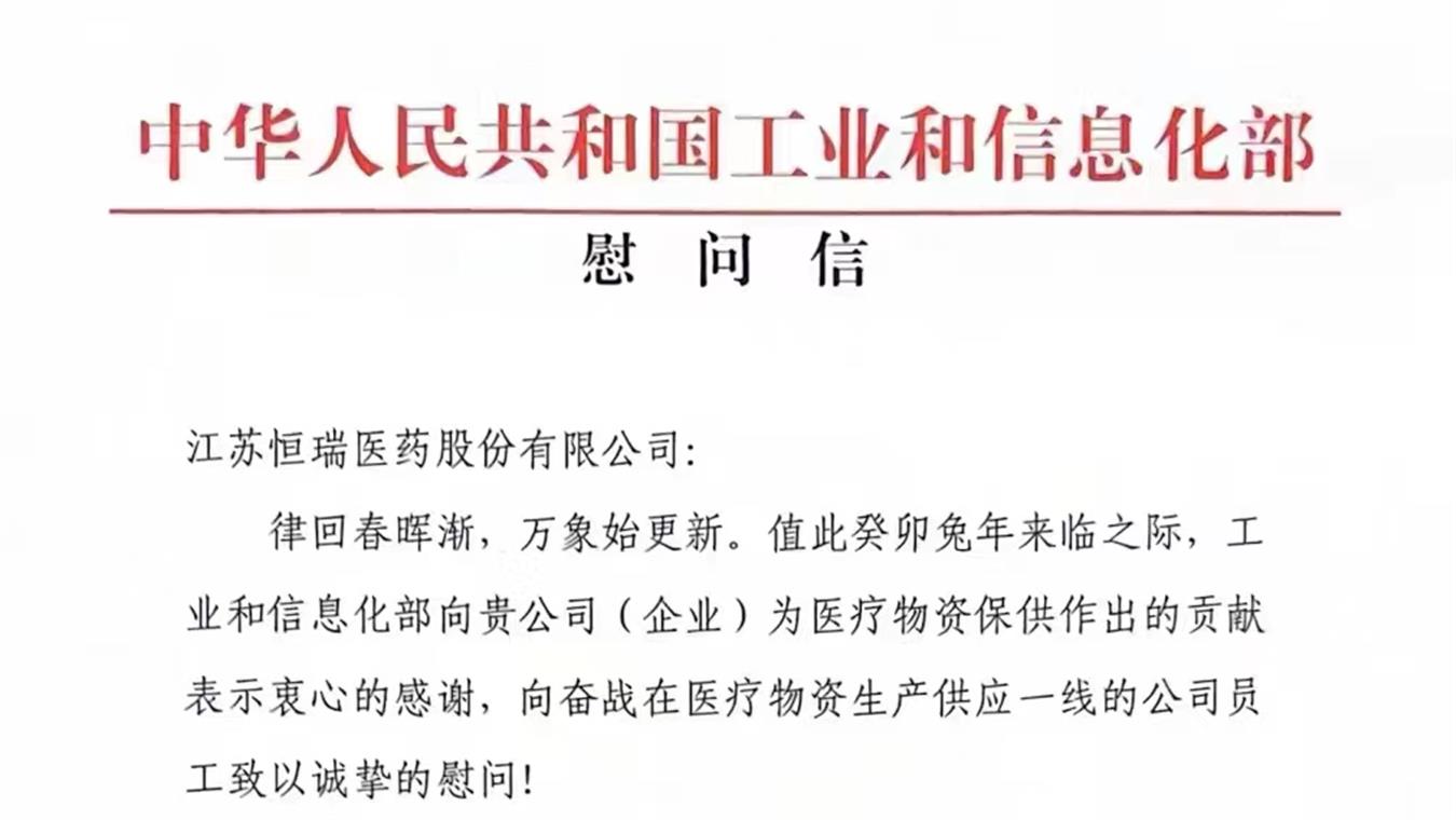 2023年1月19日,工信部向恒瑞医药发来慰问信,对公司积极做好重点药品稳产保供表示感谢